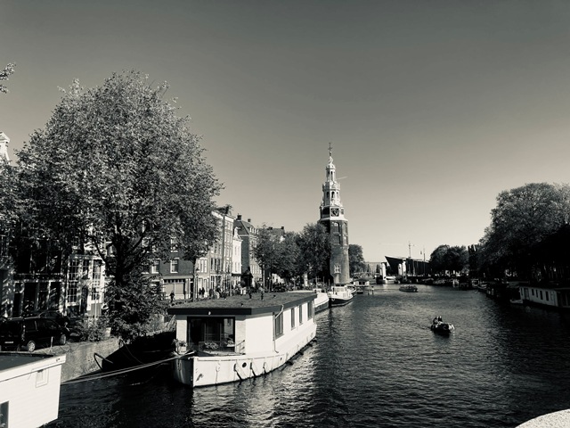 Zwartwit versterkt het tijdloze karakter van de scène. Door het ontbreken van kleur verschuift de nadruk naar contrast, structuur en architectonische details. Deze foto vangt die historische gelaagdheid op een rustige en elegante manier: een plek waar water, woonboten, oude gevels en een eeuwenoude toren samen een karakteristiek beeld vormen van het maritieme en architectonische erfgoed van Amsterdam. Hierdoor past deze foto in een modern en rustgevend interieur.