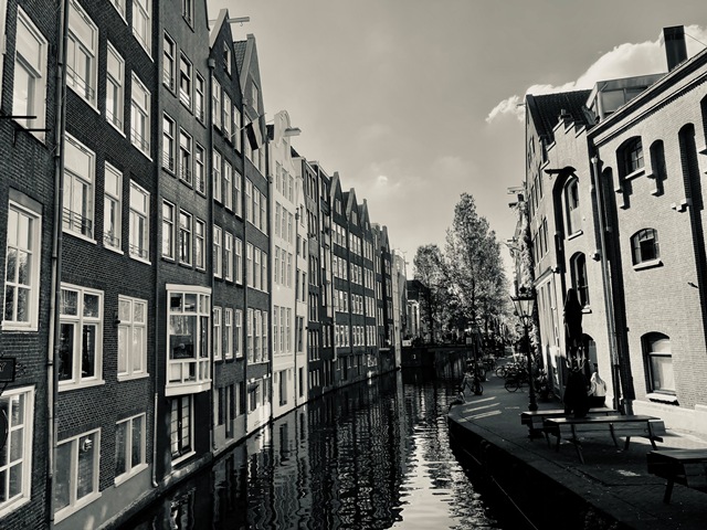 “Amsterdam Oudezijds Achterburgwal 6” is een zwartwit foto die toont een karakteristiek en sfeervol gedeelte van de Oudezijds Achterburgwal in het historische centrum van Amsterdam.