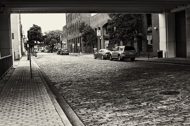 De zwartwit foto toont een karakteristiek deel van Morris Avenue in het centrum van Birmingham. Morris Avenue is één van de oudste straten van de stad. De foto is genomen vanuit de schaduwrijke ruimte onder de parkeeroverhang van het John Hand Building Condominiums.