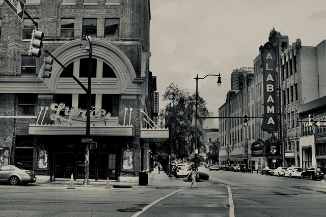 De kadrering van de foto is asymmetrisch maar zorgvuldig uitgebalanceerd. De zware massa van het Lyric Theatre links wordt gecompenseerd door de diepte en het visuele gewicht van het Alabama Theatre rechts.