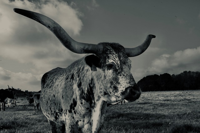 “Texas Longhorn 2” is een zwartwit foto van een rund van het Texas Longhorn ras in een weiland.