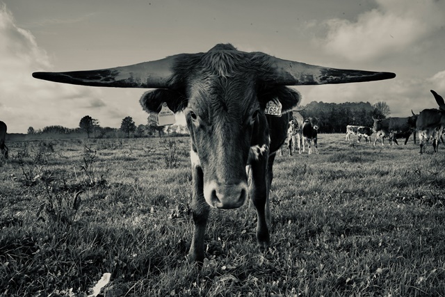 “Texas Longhorn 3” is een zwartwit foto van een rund van het Texas Longhorn ras in een weiland.
