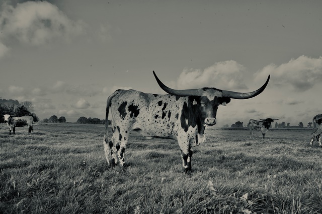 De Texas longhorn is een klein, smal rund dat hoog op de poten staat. Allerlei kleurschakeringen komen voor. De dieren hebben opvallend lange en ver uitstaande hoorns. Hierdoor past deze foto in een moderne en rustgevend interieur.